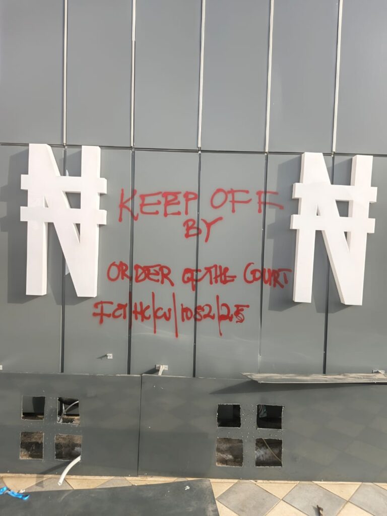 Also, a document indicating the enforcement order of court affirming ownership of the property was prominently pasted on the building.
