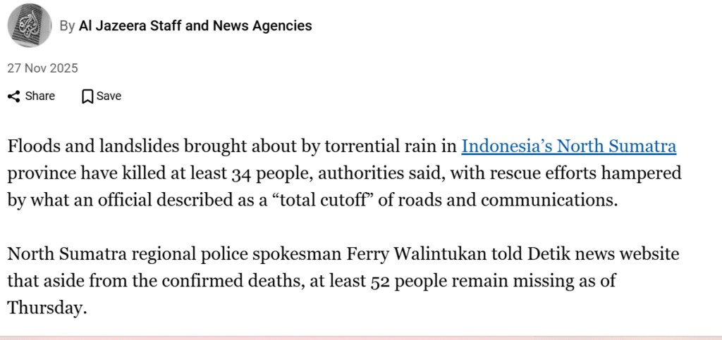 Up to 8,000 people across North Sumatra have been evacuated, and roads remain blocked by landslide debris, with aid now being distributed via helicopters, Abdul Muhari, spokesperson for the country’s disaster mitigation agency, said on Thursday.